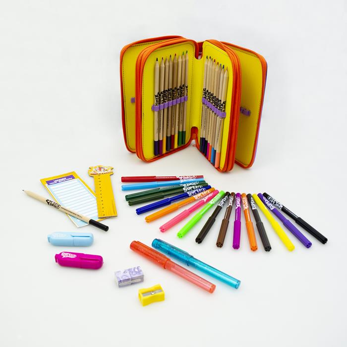 Piórnik został wyposażony w trzy przegrody, a każda z nich zapinana jest na wygodny zamek błyskawiczny. Wnętrze piórnika zostało wzbogacone o niezbędne podczas szkolnych zajęć akcesoria. Elastyczne gumki doskonale utrzymują kredki, kolorowe pisaki, długopisy i inne przedmioty w wyznaczonym miejscu co pozwala na zachowanie ładu i porządku. W zestawie nie ma kredek ani ołówka.