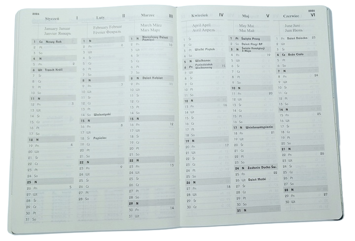 Nasz Kalendarz spełni Twoje oczekiwania! Okładka kalendarza wykonana z dwuwarstwowego termowrażliwego poliuretanu (ekoskóry), jest symbolem wyrafinowania i trwałości.