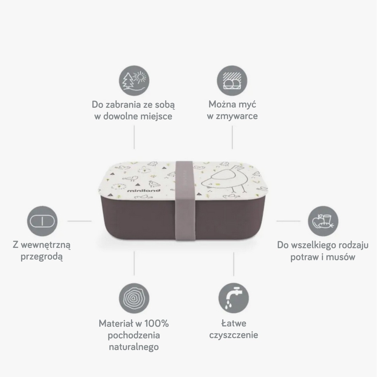 Posiada hermetyczne zamknięcie, które zapobiega niechcianym wyciekom oraz utrzymuje świeżość posiłków na dłużej, zachowując smaki i aromaty. W pudełku znajduje się także wyjmowana silikonowa przegroda do oddzielania różnych produktów spożywczych. Dzięki temu posiłek można podzielić na porcje w odpowiedniej wielkości, zgodnie z własnymi potrzebami, dodając więcej lub mniej z każdej strony.