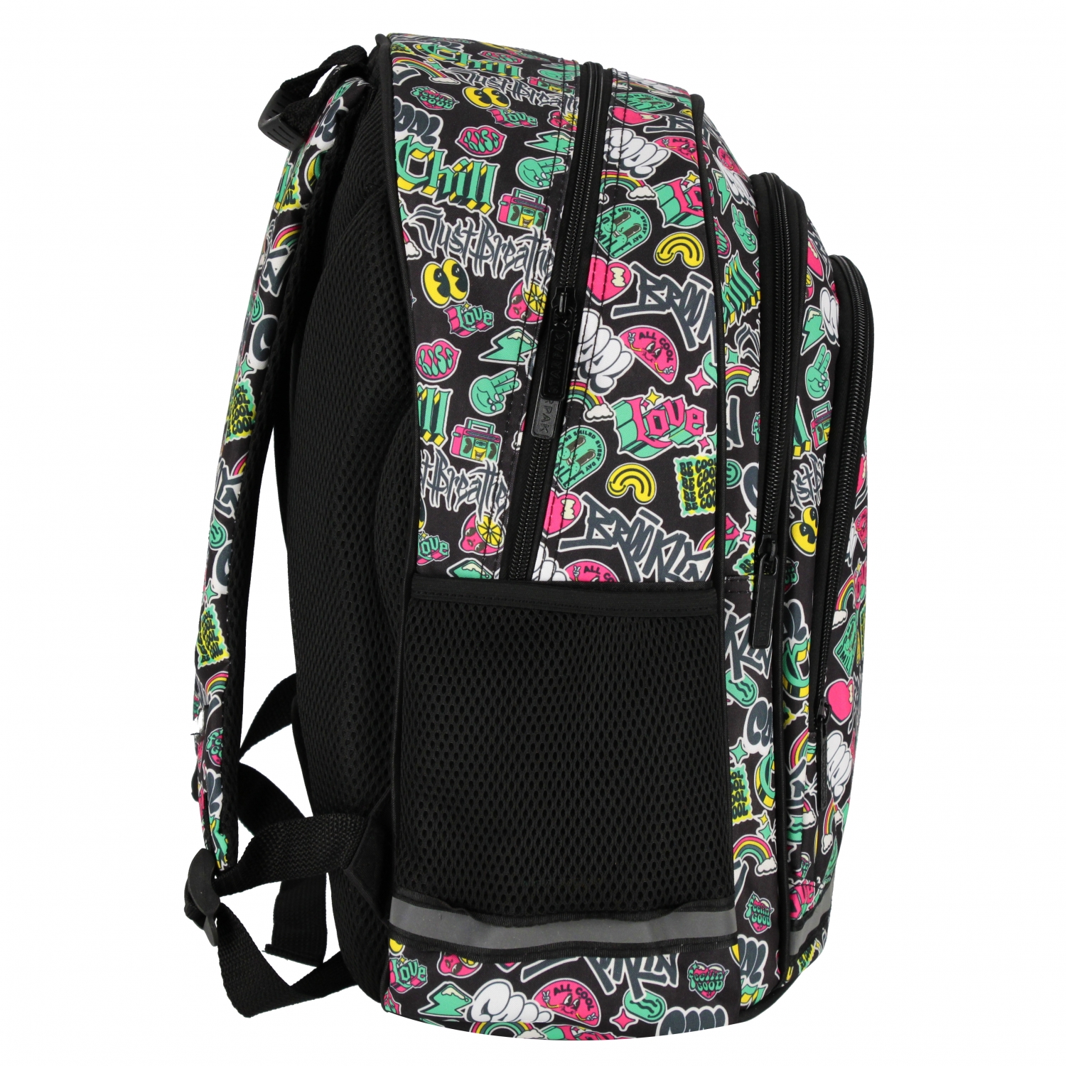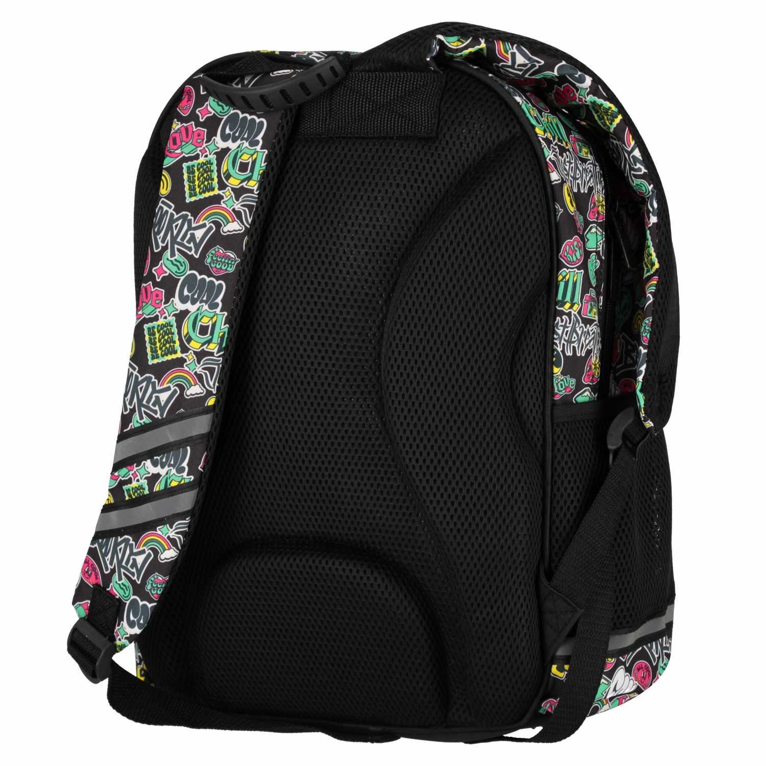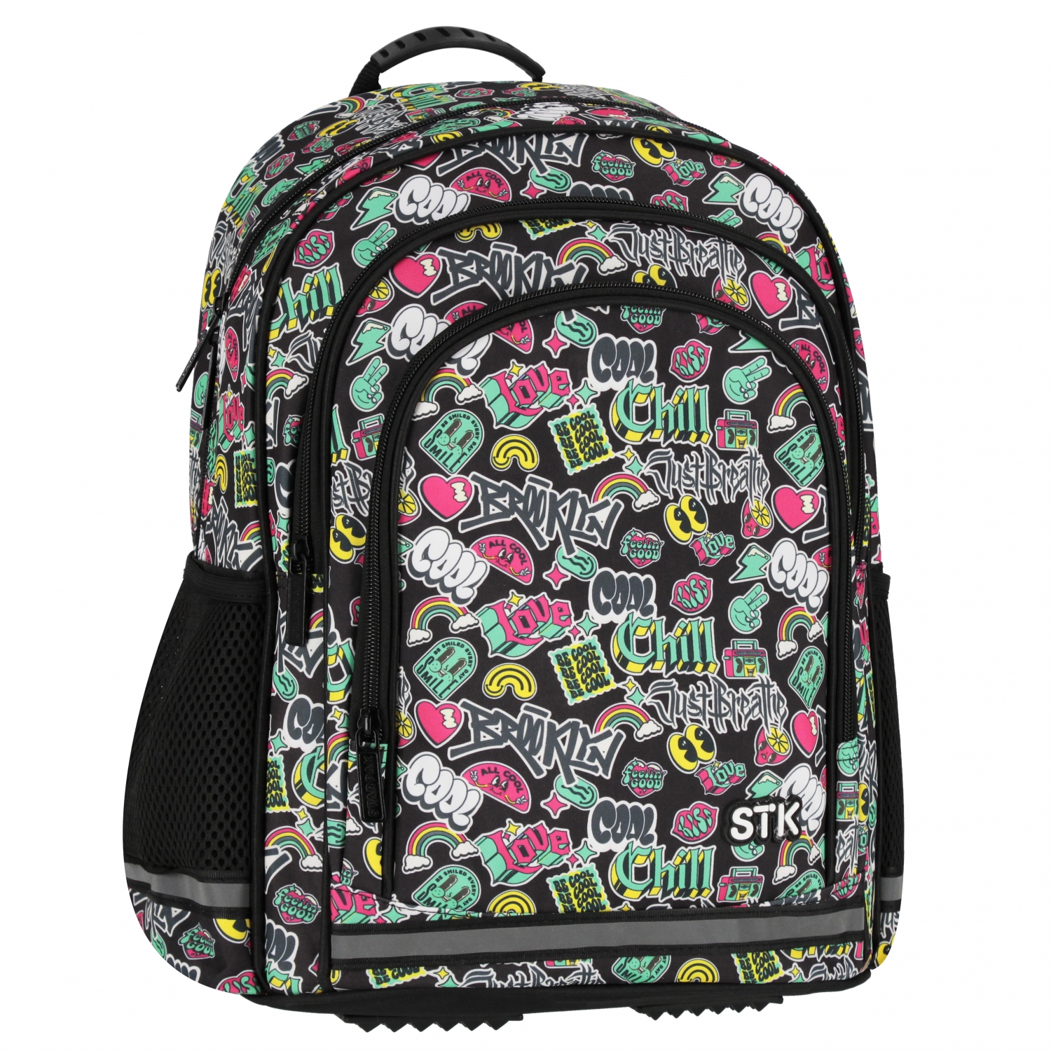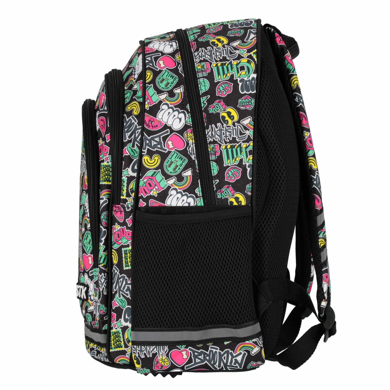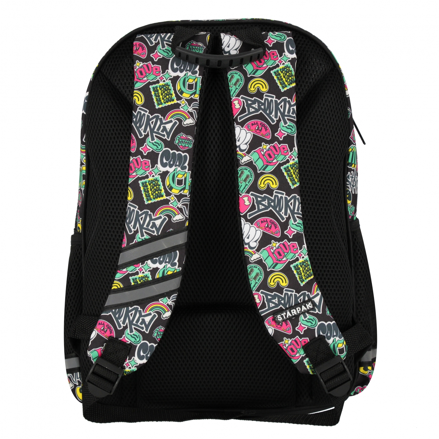 Zalety: plecak składa się z 1 dużej komory i 2 obszernych przednich kieszeni, 2 boczne wzmocnione kieszenie siatkowe na butelkę z napojem, wytrzymałe zamki błyskawiczne, plastikowe stopki na spodzie plecaka ochrona przed wilgocią i brudem , ergonomiczne plecy i szelki, plecy z systemem wentylacji dla większego komfortu, grube, miękkie szelki chronią ramiona, regulowane szelki pozwalają dopasować plecak do wzrostu i budowy ciała, uchwyt wzmocniony gumową opaską pozwalające zawiesić plecak na wieszaku lub wygodnie nosić go w ręce, odblaskowe paski umieszczone na przedniej kieszeni, na obu bocznych kieszeniach i na szelkach zwiększające widoczność plecaka w nocy bezpieczeństwo dziecka . Plecak szkolny składający się z dwóch komór zapinanych na zamek, co pozwoli na lepsze zorganizowanie wewnętrznej przestrzeni. Na zewnątrz znajduje się bardzo obszerna przednia, zapinana kieszeń, po bokach dwie kieszenie ze ściągaczem idealne na umieszczenie w nich bidonu z napojem. Plecy i szelki wyściełane gąbką zapewniają komfort użytkowania i równomierne rozłożenie obciążenia na plecach dziecka. Wykonany z trwałego materiału wykończonego elementami odblaskowymi dla większego bezpieczeństwa. Zapoznaj się również z innymi produktami STARPAK dedykowanymi młodzieży. Plecak w czarnym kolorze z młodzieżową, kolorową grafiką. Plecak jest wyrobem tekstylnym. Przeznaczony dla dzieci w wieku: 3 . Wymiary produktu wys. x szer. x gł. cm : 40x29x20, pojemność plecaka 23 l, waga produktu kg : 0,72 kg. Plecak pakowany w folię. w kartonie po 12 szt.