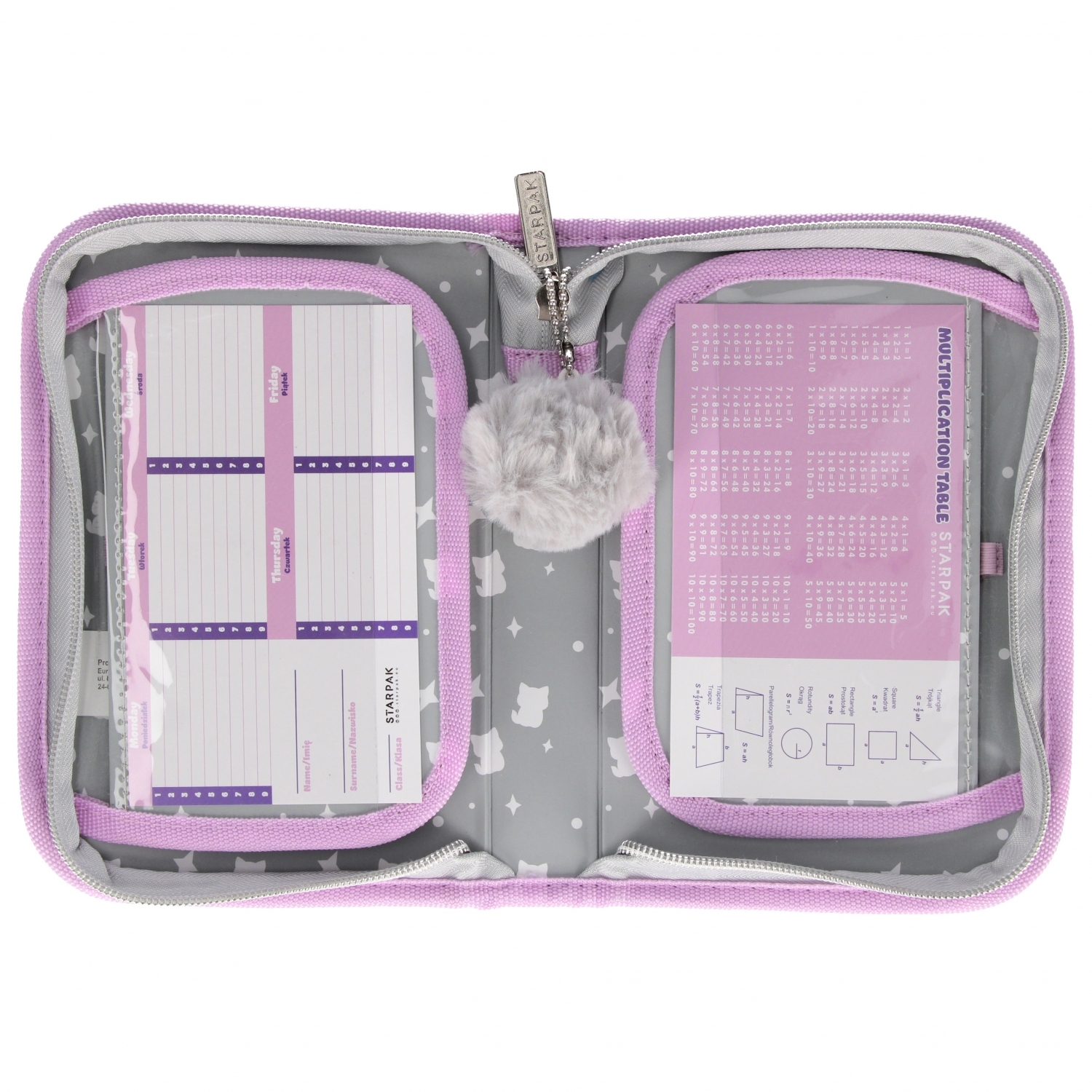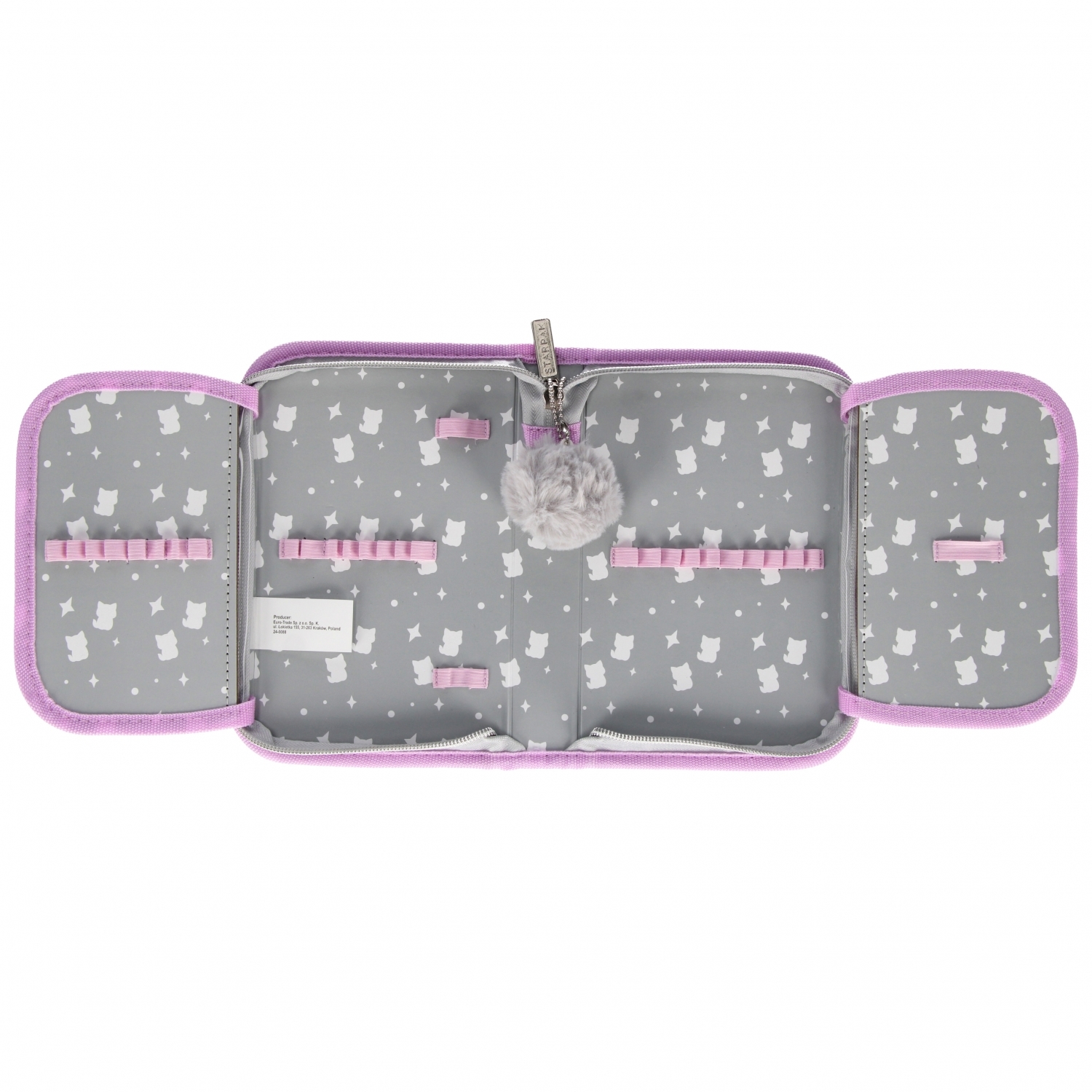 Zalety produktu: 2 rozkładane klapki, odporny materiał, mocny zamek błyskawiczny z uroczym pomponem, trwałe uchwyty na przybory, po złożeniu zajmuje mało miejsca. Duży piórnik z 2 skrzydełkami i elastycznymi uchwytami na przybory szkolne zapinany na mocny zamek. Pozwoli pomieścić wszystkie potrzebne artykuły piśmiennicze i samemu skompletować asortyment. Pomieści flamastry, kredki, pióro, długopis, ołówek, plan zajęć i wiele innych. Piórnik STARPAK jest odporny na uszkodzenia. Można go łatwo rozłożyć na płasko. Dostęp do przyborów jest wtedy bardzo łatwy. Po złożeniu jest mały i spokojnie zmieści się w każdym plecaku lub worku. Zapoznaj się również z innymi produktami STARPAK z serii Kitty plusz Wymiary/waga: dł. x wys. x gł. cm : 21x14x4, rozłożony szer. cm : 31 cm, waga produktu kg : 0,19 kg. Produkt jest wyrobem tekstylnym. Przeznaczony dla dzieci w wieku: 3 . Piórnik pakowany w folię. Pakowanie iner 12szt, karton zbiorczy 48szt.