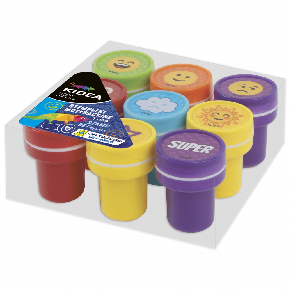 Stempelki dla dzieci z motywacyjnymi emotikonkami od Kidea. W zestawie znajduje się aż 9 pieczątek w różnych kolorach: żółtym, pomarańczowym, czerwonym, zielonym, niebieskim i fioletowym. Stempelki pomogą wyrazić takie emocje jak radość, smutek, znudzenie, czy miłość. Doskonale sprawdzą się również podczas oceniania prac dzieci oraz przy prowadzeniu tablicy motywacyjnej i dziennika nastrojów. Stempelki są samotuszujące, co oznacza, że nie trzeba dodatkowo maczać ich w poduszce z tuszem